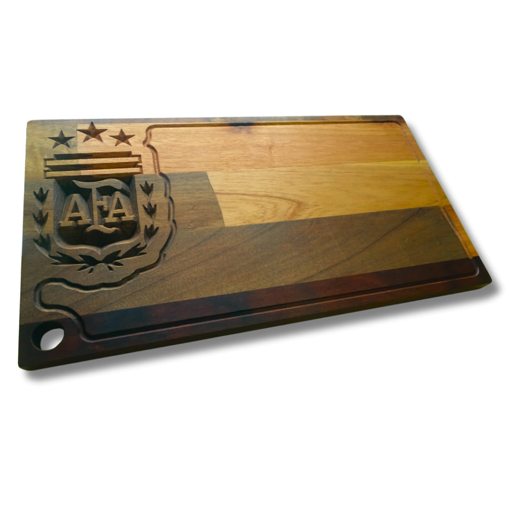 Tabla de MADERAS MULTICOLORES, con el escudo de AFA tallado al detalle. Cada tabla combina distintas maderas duras seleccionadas, creando un contraste natural único y lleno de carácter.