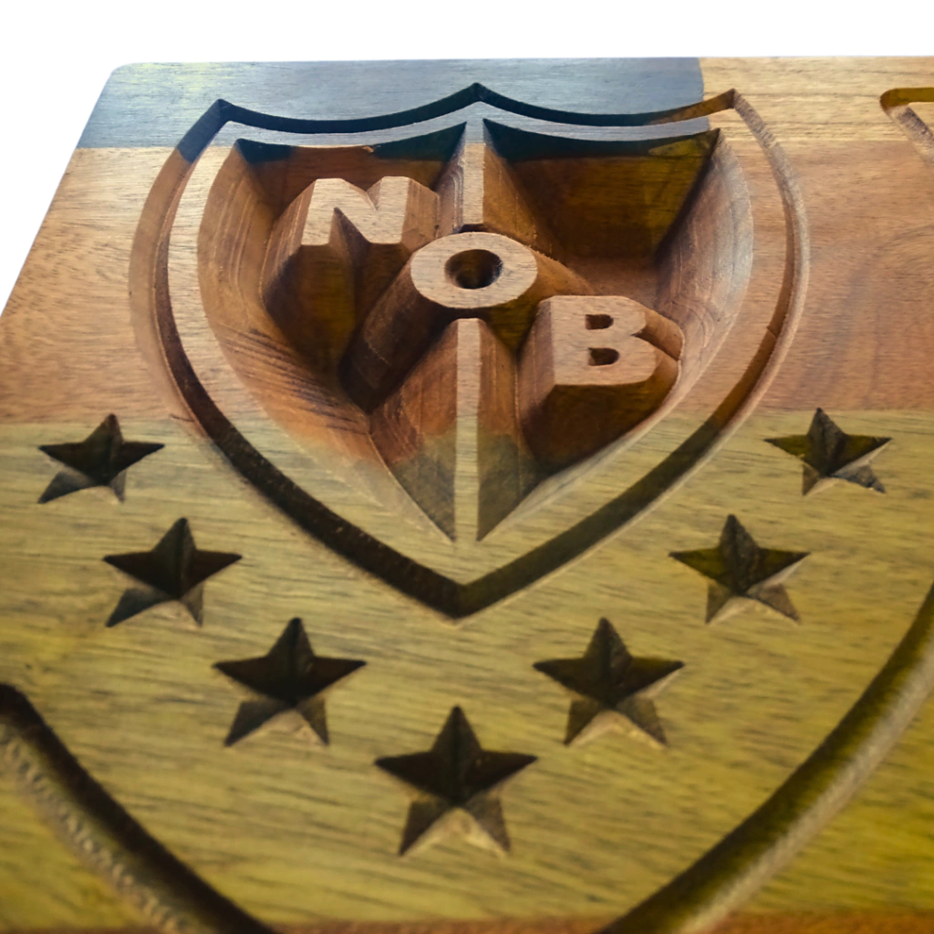 Tabla de MADERAS MULTICOLORES, con el escudo de Newell´s tallado al detalle. Cada tabla combina distintas maderas duras seleccionadas, creando un contraste natural único y lleno de carácter.