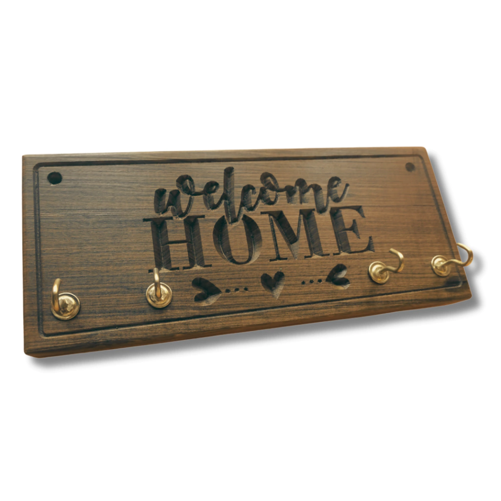 Nuestro portallaves de madera guayubira es una pieza artesanal que combina funcionalidad y estilo. Con la inscripción 'Welcome Home', no solo mantiene tus llaves organizadas, sino que también te recibe con calidez a tu hogar.